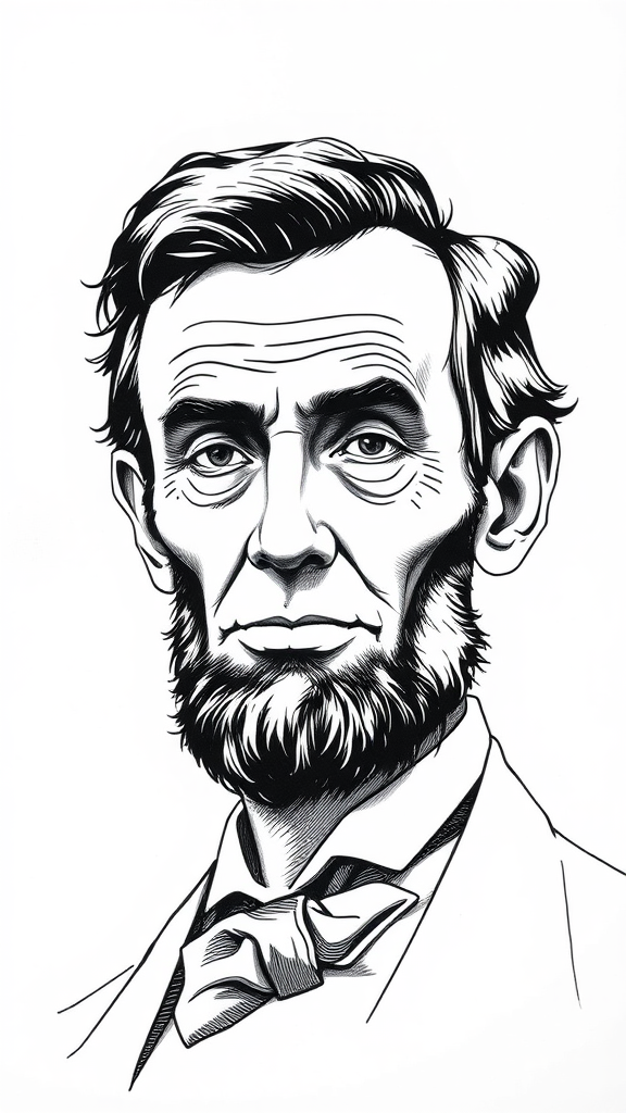 Ultra-detailed ink illustration, depicting Abraham Lincoln in a hyperrealistic style, face highlighted against a plain white backdrop, with subtle creative elements integrated into the portrait design.