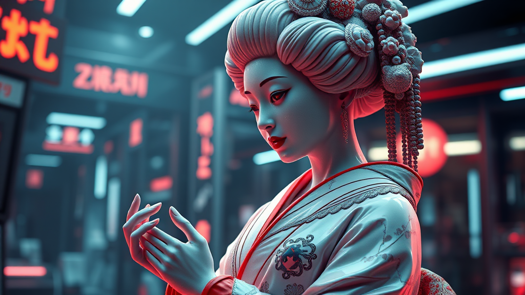 Ultra detailed marble and jade sculpture of a geisha, hyperrealistic, breathtaking realism with intricate details, set against a futuristic cyber background. Cinematic lighting enhances the scene, resembling a stunning photograph taken with a Hasselblad H3DII. The environment is mesmerizing, utilizing a wide-angle perspective to capture every nuance. The scene is reminiscent of highly detailed, 3D rendered art but maintains a sense of authenticity and realism. The geisha's form is exquisite, avoiding any anomalies such as extra limbs or distorted features, ensuring the sculpture remains elegant and true to form.