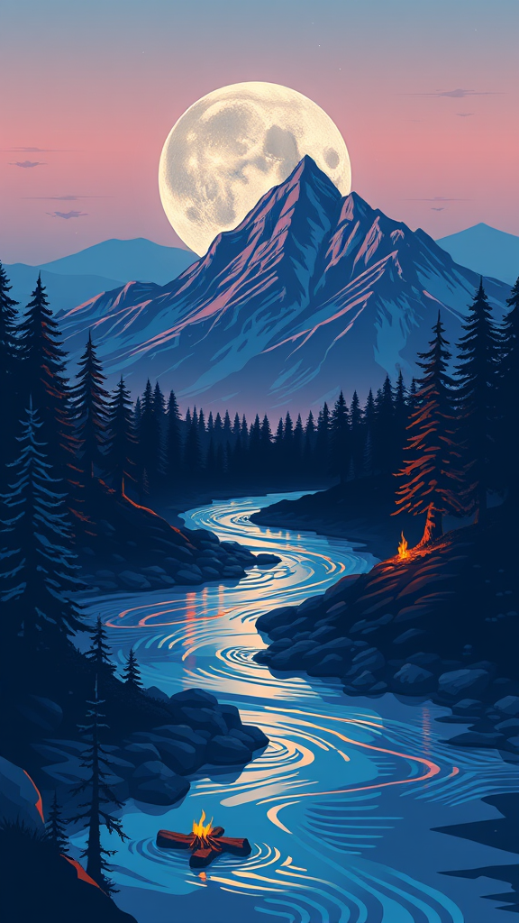 Ultra detailed mountain and sky vector art featuring a mesmerizing detailed moon. Pine trees stand tall alongside a meandering river, illuminated by a small campfire casting a warm reflection on the water. A stunning 2D vector illustration showcasing vibrant colors in a modern vector style with minimalistic design yet intricate detail. Shadows play with the moonlight reflection, creating a masterpiece of professional work. This stunning piece is inspired by works trending on Behance, Dribbble, and Shutterstock. Despite being high-resolution and expertly crafted, avoid attributes like low res, error, cropped, or out of frame flaws. The visual evokes a branded feel, akin to an emblem or insignia. Typography and font elements blend seamlessly with art, reminiscent of manuscripts, logos, and digital illustrations. Envision two levitating moons adding an artistic twist, complete with a split illustration approach for dynamic storytelling.