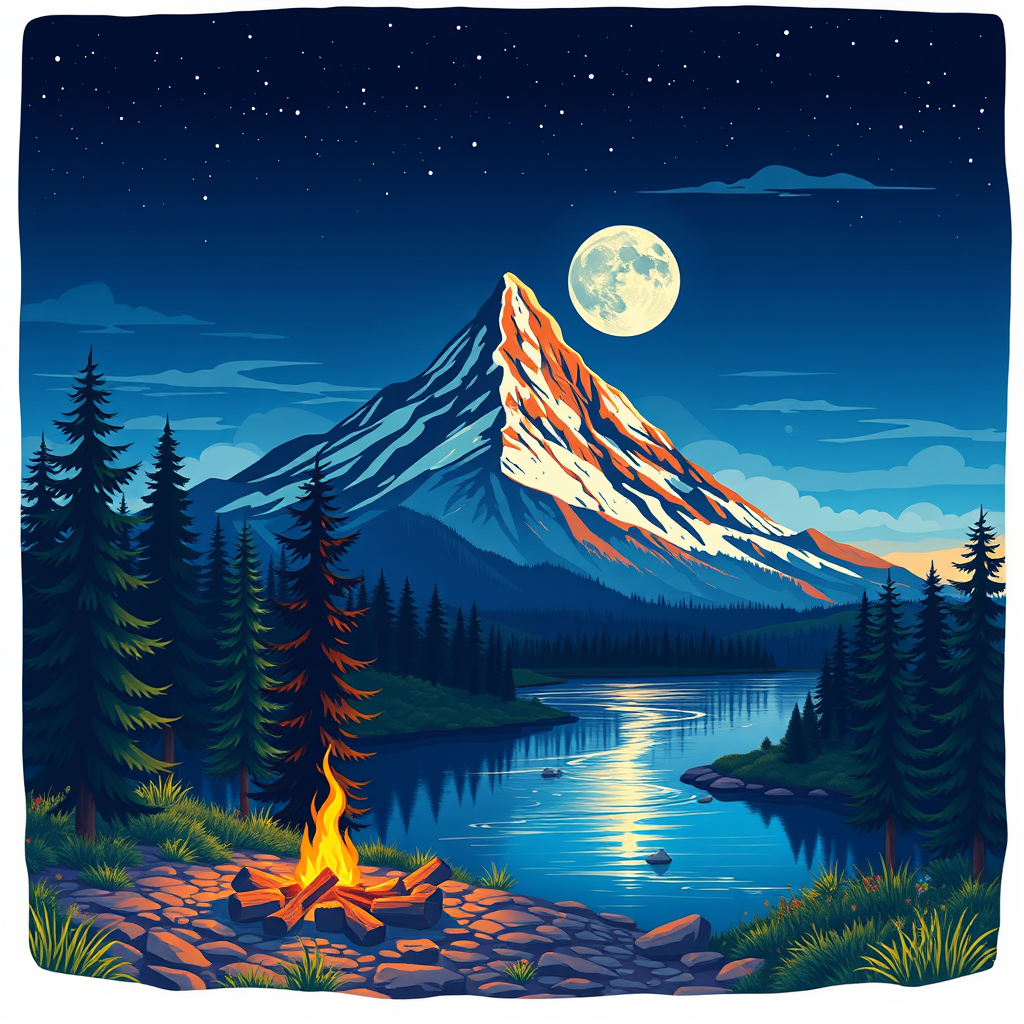 Ultra detailed mountain vector art, vibrant and colorful vector illustration of a serene landscape, featuring a detailed sky with a realistic moon, complemented by lush pine trees and a tranquil river scene. A small, inviting campfire rests beside the river, casting gentle reflections of firelight and moonlight on the water's surface. This modern vector art embraces a minimalist design with flat colors, yet maintains intricate detailing, creating a professional masterpiece that could easily be a Behance contest winner or trending on Dribbble and Shutterstock. The scene suggests a new perspective with a levitating mountain and the presence of two moons, evoking a sense of wonder. The emblematic beauty is comparable to a vivid monogram or insignia, where digital illustration meets the world of branding and typography. The art is devoid of low resolution, errors, or artifacts, ensuring its high quality and stunning appearance, making it a signature piece without being deformed or out of frame.