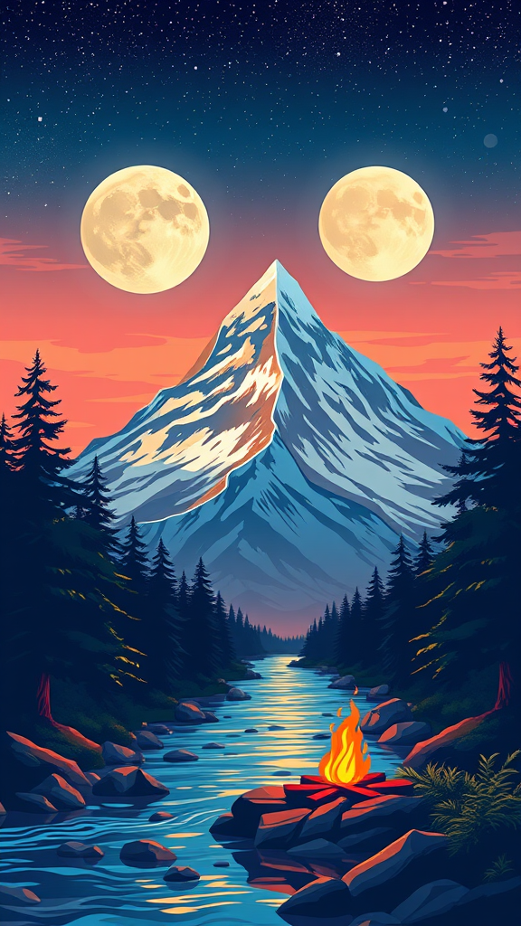 Ultra detailed mountain vector art with a beautifully intricate sky vector background featuring two moons casting moonlight reflections. The scene includes detailed pine tree vectors and a serene river vector backdrop with a small campfire, artfully illuminating the foreground with its reflection light. This 2D vector illustration showcases modern vector art with vibrant colors and flat colors, embodying a minimalistic yet intricate design. Designed as a professional masterpiece trending on Behance and Dribbble, the composition is complete with vector illustrations of mountains and celestial elements, displaying a majestic levitating mountain under two glowing moons. The artwork is styled with an emblematic touch, drawing inspiration from typography, calligraphy, and branding elements to create a vibrant, colorful vector illustration worthy of the finest digital collections.