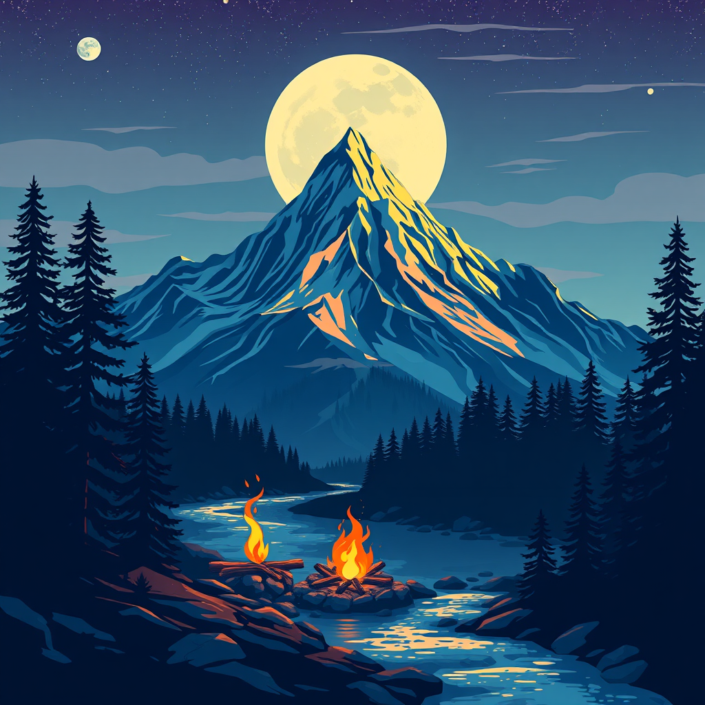 Ultra detailed mountain vector art with a vibrant color palette featuring a detailed sky and moon background, accompanied by intricate pine trees and a serene river reflecting moonlight. A small campfire adds warmth, casting light and shadows in this 2D vector illustration. The scene is modern yet minimalistic, showcasing flat colors and intricate art. The composition is akin to a Behance contest winner, with professional quality and elements trending on platforms like Dribbble and Shutterstock. The mountains and moon are perfectly shaped, avoiding any deformities, with reflections illustrated masterfully. This vector art serves as an emblem or insignia, capturing the essence of a serene night in nature. Additional creative elements include a subtly levitating mountain and hints of typography artfully embedded within the scene, giving it a unique stamp of artistry and branding.