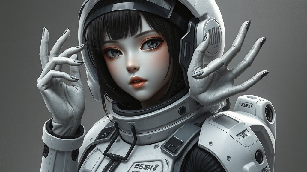 Ultra-detailed painting of a stunning girl in an EVA plugsuit, intricately rendered in an anime style reminiscent of Greg Rutkowski, currently popular on ArtStation. Features JPEG artifacts with subtle quality reduction, characterized by a low-res 3D render reminiscent of a doll with a glossy plastic finish. Enveloped in soft blur and subtle haze, presented in monochrome with black and white elements. Text elements intermingled with art reveal slightly malformed, mangled hands and an abstract, misshapen figure with an avant-garde twist of missing limbs and features. Hands disjointed with extra fingers and arms, combined with distorted anatomy and unconventional proportions. Subtle presence of a watermark or logo adds an authentic touch.