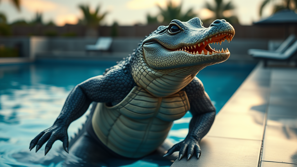 Ultra detailed photograph of a striking anthropomorphic crocodile embodying an athletic modern machoman aesthetic, wearing sleek swimming attire, posed luxuriously by the pool's edge. The composition captures admiration and awe, with hyper-realistic details and intense emotion conveyed through epic cinematic lighting. Shot in 32k UHD resolution, utilizing a Hasselblad H6D 400c Multi shot with a Mitakon Speedmaster 35mm f/1.2 XCD lens. The style is expressive, the proportions are elongated in a 1:2 aspect ratio, blending anime influences with a vibrant and vivid palette, bringing out unique character and personality in a cinematic landscape.