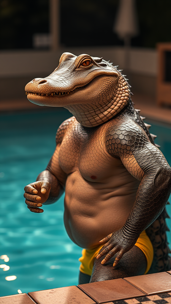 Ultra detailed photograph of a striking anthropomorphic crocodile embodying the perfect athletic modern machismo in sleek swimming attire, confidently striking a luxurious pose by the pool, the composition captivates with its sense of admiration, hyper realistic and intricately detailed, overflowing with emotion, epic cinematic lighting enhances every feature, captured in 32k UHD resolution, shot on Hasselblad H6D 400c Multi-Shot with Mitakon Speedmaster 35mm f/1.2 XCD lens, exhibiting an expressive style, aspect ratio of 1:2, infused with an anime-inspired essence, version niji 5, with vibrancy and detail meticulously adjusted to create a mesmerizing impact.