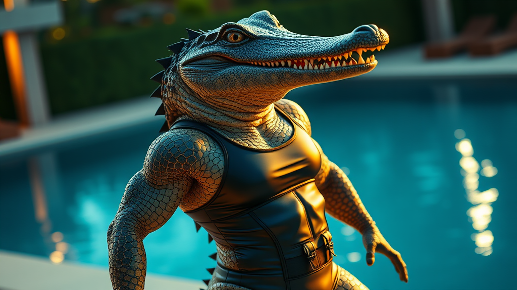 Ultra detailed photograph of a striking anthropomorphic crocodile athlete in sleek modern swimwear, exuding confidence in an elegant pose by the poolside, showcasing a mesmerizing blend of strength and charm, hyper realistic and intricately detailed, conveying deep emotion, dramatic cinematic lighting, 32k UHD resolution, captured on a Hasselblad H6D 400c Multi Shot, Mitakon Speedmaster 35mm f/1.2 XCD lens, style expressive, cinematic aspect ratio 1:2, infused with anime aesthetics, rendered with enhanced saturation and quality level 3.