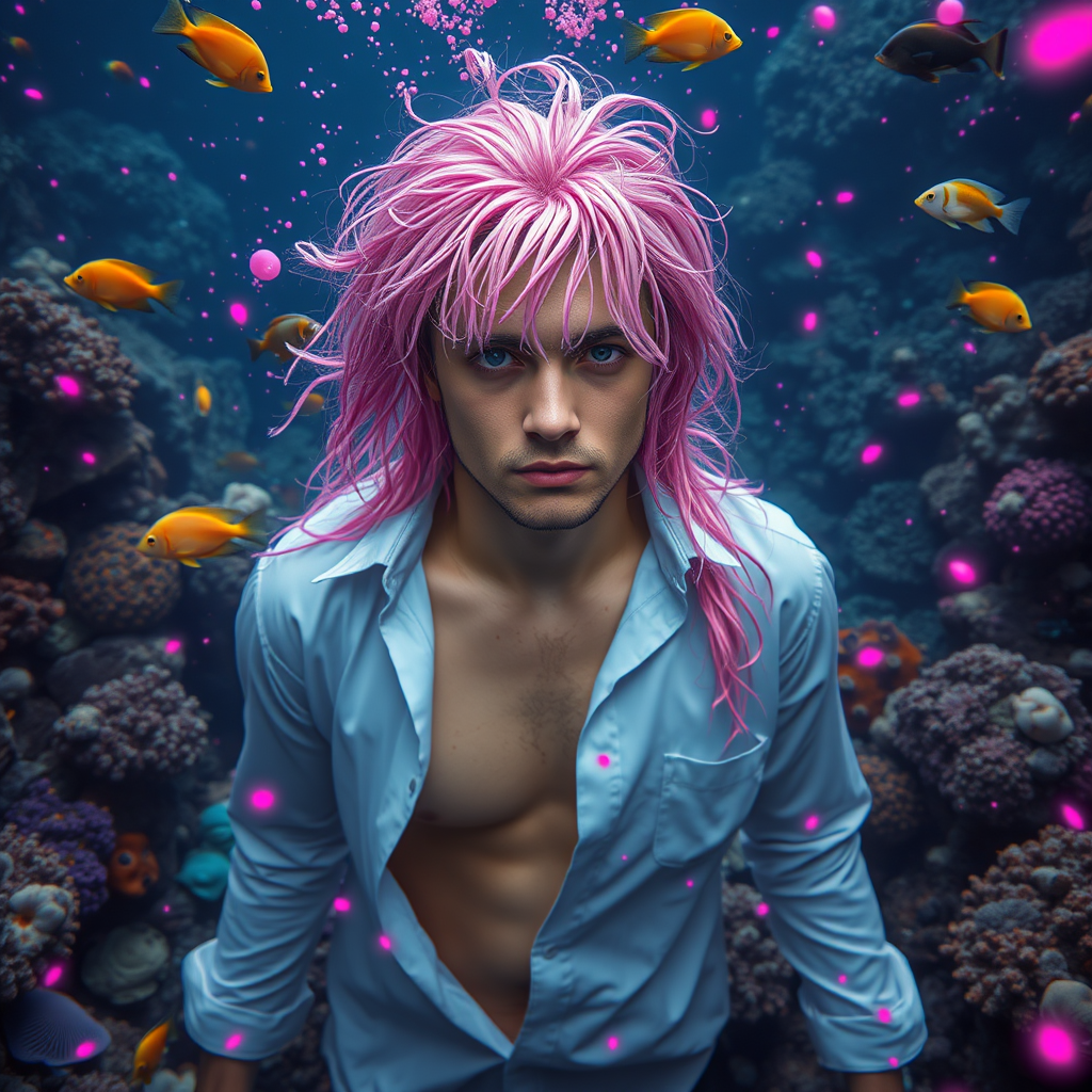 ultra detailed, pink hair with long messy curls and ahoge, wearing a wet white shirt unbuttoned, submerged in the ocean among vibrant fishes, colorful coral reefs, and shells, expressionless, surrounded by glowing pink particles, captured in UHD, HDR, 8K, avoiding duplicates or distortions.