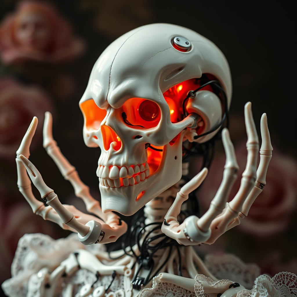Ultra detailed porcelain reaper skull android face, cyborg with intricate robotic parts, 150 mm, illuminated by beautiful studio soft light and accented with rim light, showcasing vibrant details, luxurious cyberpunk aesthetic intertwined with delicate lace. The composition is hyperrealistic, revealing anatomical facial muscles integrated with cable electric wires and microchips. An elegant juxtaposition against a beautiful background, rendered with octane quality, reminiscent of H. R. Giger's iconic style. Despite its sophistication, the creation is intentionally flawed with poorly drawn hands, a missing limb, and elements like blurry, floating, and disconnected malformed hands. With a long neck and elongated body, it sits in a stylistic blender-like doll universe. The image is cropped and low-res, focusing on a close-up yet maintaining an out-of-frame double exposure effect. Two heads subtly merge with blurred imperfections, and the figure is adorned with too many fingers, deformed yet repetitive features. Presented in black and white, it offers a grainy texture with extra limbs and intentional bad anatomy, enriching the enigmatic and surreal cyborg narrative.
