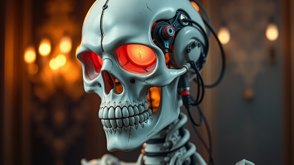 Ultra detailed porcelain reaper skull android face with intricate cyborg and robotic elements, designed at 150 mm. Captured in beautiful studio soft light with a striking rim light, showcasing vibrant details and a luxurious cyberpunk aesthetic. Features elegant lace details, hyperrealistic anatomical aspects, including facial muscles intertwined with electric cables and microchips. Set against a beautiful, sophisticated background with an octane render style reminiscent of H. R. Giger. The android has a long neck and body, with some artistic touches like a cropped, out-of-focus appearance to parts, conveying an avant-garde, abstract feel. It presents a mesmerizing blend of elegance and anatomical detailing, maintaining an otherworldly charm while suggesting a disconnection from traditional human form through creative modifications like floating, disconnected elements.