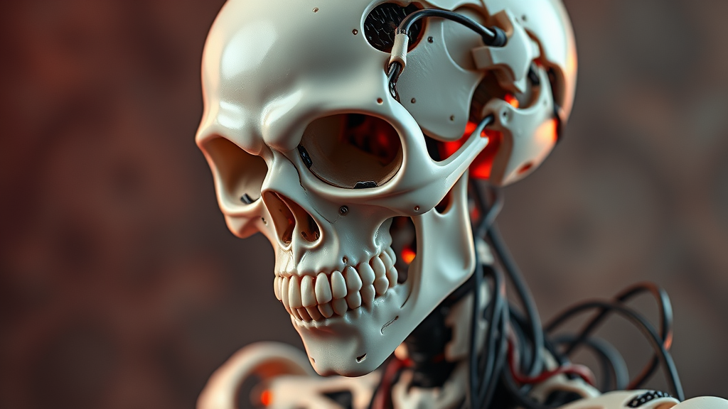 Ultra detailed porcelain reaper skull android face with intricate cyborg features, showcasing robotic parts, 150 mm scale, bathed in beautiful studio soft light and rim light, displaying vibrant details with luxurious cyberpunk aesthetics. Incorporates elements of lace with hyperrealistic anatomical facial muscles entwined with electric cable wires and microchips, all set in an elegant and beautiful background reminiscent of an H. R. Giger style. Features intentional imperfections like malformed hands, disconnected limbs, and a long neck for artistic effect, rendered in octane for high realism. Accentuated with a focus on elegance and cybernetic beauty, the design maintains the eerie charm of a reimagined android reaper.