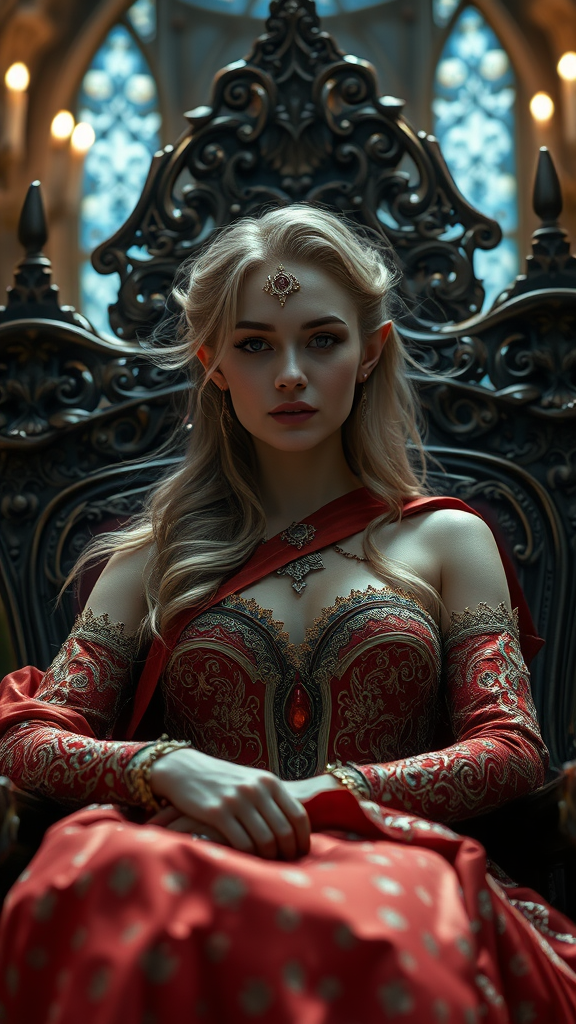 Ultra-detailed portrait capturing the upper body of a captivating royal elf woman, her enchanting face framed by flowing hair, adorned in a luxurious, intricately designed gown. She reclines elegantly on an opulent throne in a vast, ornate hall of a fantasy castle. The atmosphere is enhanced with a shallow depth of field and cinematic lighting, akin to a film still. Shot on a Nikon D850, the HDR quality reveals every texture and color in stunning 8k resolution, adding to the ethereal allure of this CyberRealistic scene, with subtle undertones reminiscent of a dreamlike reverie.