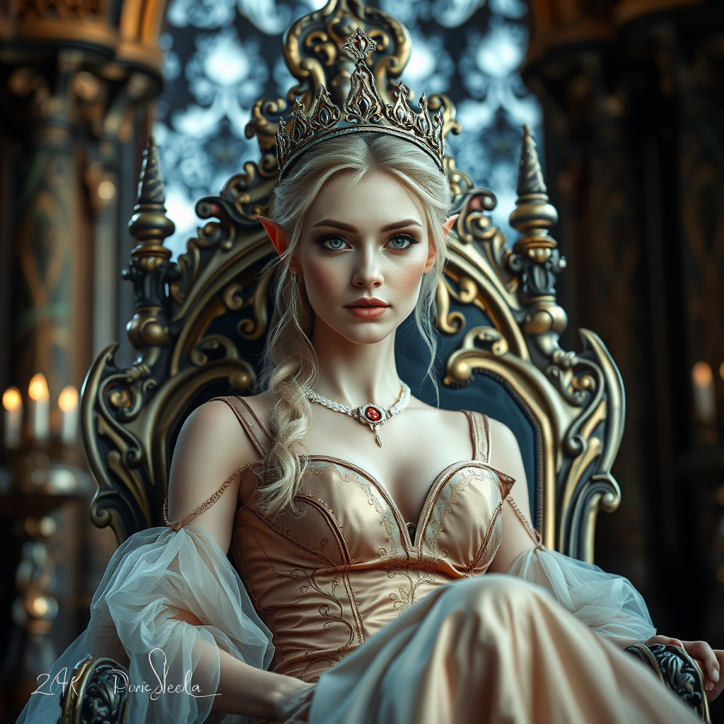 Ultra-detailed portrait of a captivating royal elf woman, strikingly beautiful with an enchanting gaze, adorned in an opulent gown, seated gracefully on an ornate throne in a magnificent fantasy castle chamber, enhanced by cinematic lighting and shallow depth of field, captured with the clarity of a Nikon D850, evoking the allure of a film still, rendered in HDR 8k with a hint of ethereal realism, accentuating her dreamlike presence amidst the grand setting.