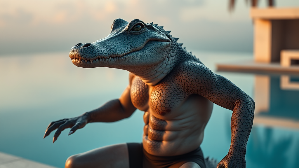 Ultra detailed portrait of a striking anthropomorphic crocodile in athletic modern swimwear, exuding confidence and sophistication as it strikes a luxurious pose beside a serene pool; capturing a sense of awe with a hyper realistic and highly detailed focused expression, showcasing a vivid emotional depth. Captured with epic cinematic lighting in 32k UHD resolution, emulating the clarity and depth of a Hasselblad H6D 400c Multi-shot camera, and utilizing the Mitakon Speedmaster 35mm lens. Features an expressive and dynamic style with an engaging and vibrant color palette, seamlessly blending elements of realism with an anime-inspired flair, achieving a unique fusion of storytelling and visual artistry.