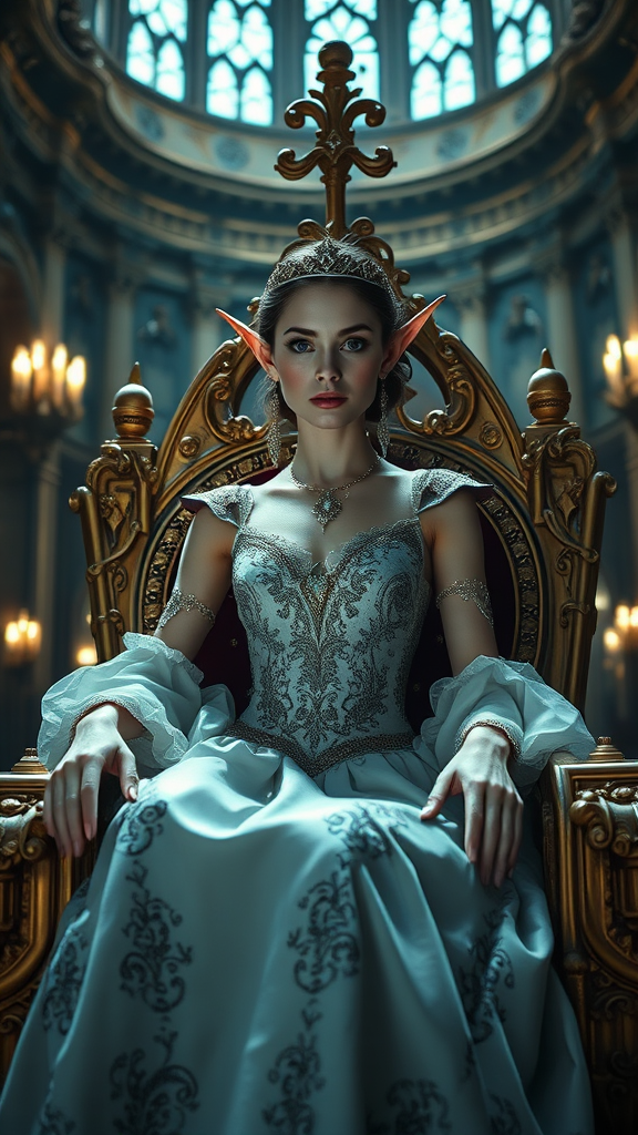 Ultra-detailed portrait of an alluring royal elf woman with a captivating expression, elegantly adorned in an opulent gown, seated gracefully on an ornate throne in an expansive fantasy castle hall; the atmosphere enriched by dramatic cinematic illumination, captured with Nikon D850 quality, evoking a film still with HDR precision in 8k; a subtle ambiance of Cybernetic Realism balanced by underlying dreamlike imperfection.