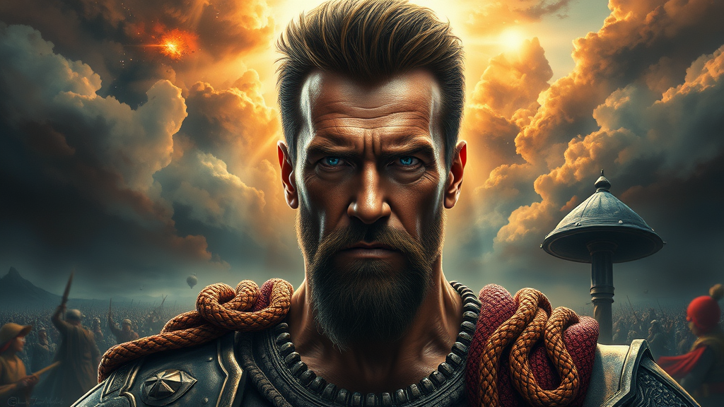 Ultra detailed stunning painting depicting Arnold Schwarzenegger as the God of War, centered with an intense and commanding presence, trending on artstation. Realistic and cinematic features with dramatic lighting and shadows bring depth to the portrait. The style blends the intricate detail of Greg Rutkowski with the vibrant, atmospheric touches reminiscent of Makoto Shinkai, incorporating a mythical battlefield backdrop with stormy skies and subtle celestial elements, enhancing the divine aura surrounding the figure.