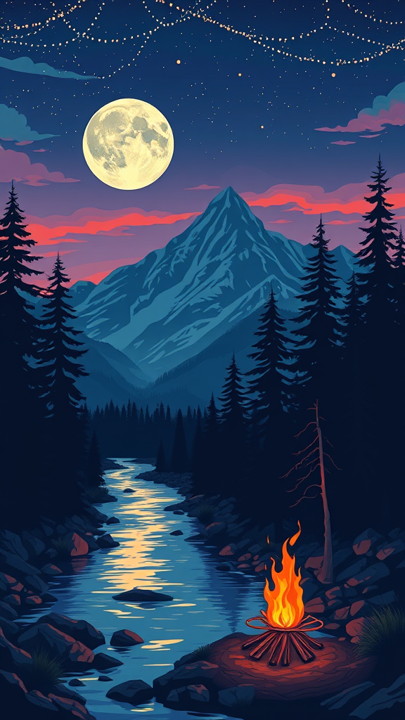 Ultra detailed vector art featuring a serene mountain landscape with a vibrant, expressive sky. The night scene is illuminated by a meticulously crafted moon, casting its gentle reflection on a flowing river. Majestic pine trees stand tall and are illustrated with precision. A small campfire crackles at the heart of the scene, its warm glow reflecting off the river's surface. The style is modern and minimalistic, with flat, bold colors enhancing the composition. The artwork exudes professionalism and creativity, reminiscent of trending pieces on platforms like Behance and Dribbble. Intricate details are emphasized, from shadow play to the moonlight's dance on the water, capturing an almost surreal beauty. The emblematic elements of the scene are reminiscent of an artist's signature style, with no deformations or low-quality issues affecting the artwork. The vector piece is a harmonious blend of typography and illustration, creating a captivating visual narrative.