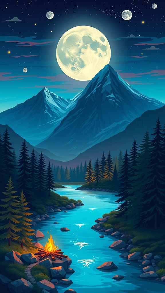 Ultra detailed vector art featuring majestic mountains, a vibrant and intricate sky, a beautifully detailed moon, lush pine trees, and a serene river. A cozy small campfire glows softly, surrounded by rich 2D vector illustrations in vivid colors, combining modern minimalistic design with flat hues. The campfire's light casts gentle reflections on the river, harmonizing with the moonlight's shimmering dance. Shadows play whimsically, creating a masterpiece suitable for professional submission. The scene, impeccable and trending across platforms like Behance and Dribbble, is reminiscent of contest-winning works but avoids artifacts, watermarks, and quality issues. Innovative elements like dual moons and levitating mountains add whimsical intrigue while maintaining elegance. Elements of branding and typography are subtly embedded, enhancing the visual narrative.