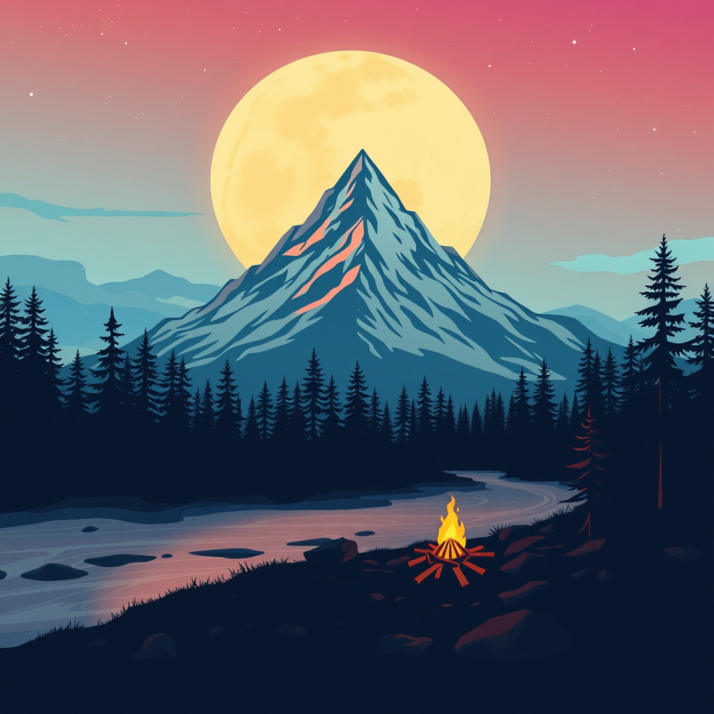 Ultra detailed vector art of a mountain scene featuring a detailed sky and vibrant, detailed moon background. The illustration includes intricately designed pine trees and a river, with a small campfire adding a warm glow. In the foreground, the campfire casts reflections against the river, with moonlight casting shadows across the vibrant, minimal design. This 2D vector illustration utilizes flat colors and a modern, colorful approach to create a masterpiece suitable for trending platforms like Behance and Dribbble. While avoiding issues like low resolution or jpeg artifacts, the scene captures a professional quality emblematic of an award-winning piece. The design incorporates elements of typography and logo-like qualities, making it suitable for branding, with an added creative twist of a levitating mountain and two moons featured in the harmonious composition.