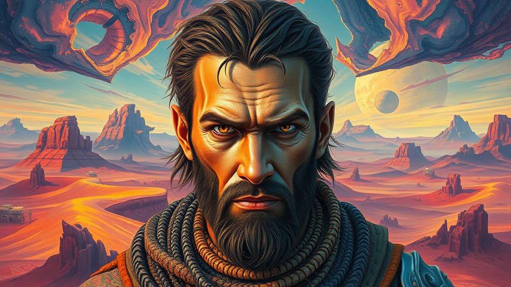 Ultra detailed vibrant painting of a rugged male Dune character, intricately designed, set in a psychedelic and surreal desert landscape. Inspired by the styles of Conrad Roset, Greg Rutkowski, and Makoto Shinkai, the portrait is centered and showcases a mesmerizing blend of realism and cinematic flair. The character's intense gaze and expressive features are highlighted, with intricate patterns and colors flowing throughout the scene. The artwork has a dynamic composition and is trending on ArtStation, exuding a sense of depth and wonder with a touch of otherworldly elegance.