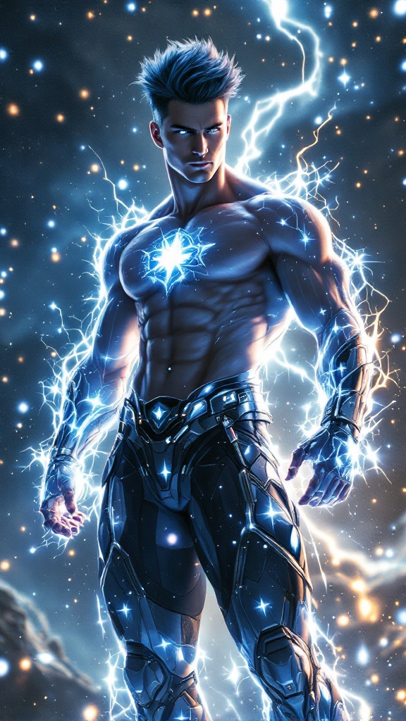 Ultra-futuristic super-hero, cosmic being, space warrior. He radiates energy like a star, and can blast his enemies with pure blue-violet cosmic energy/light. His eyes shine with pure white light like stars. He can create and control energy on a molecular level, giving him near limitless power. He can fly through the vacuum of space without needing to breathe, he lives in the cosmos. Hypermasuline Caucasian male. Tall, muscular, bodybuilder's physique, perfect body. Large massive muscles, wide chest and back, well defined abs, narrow waist, thick sinewy arms with big biceps. Strong powerful legs. Strong brow and squared jaw, handsome masculine rugged face. Clean shaven hairless face, super-hero good looks. Eyes shine like stars with pure white light. High fade medium spike hairstyle, short on sides and back, medium spikes on top of head, longer towards the front. Hair is blue-black, dark and shiny. He is completely shirtless, only a shiny chrome harness across his massive chest. A chrome tech belt around his waist with a blue-violet light a the center. Shiny chrome gauntlets on his forearms, also with blue-violet lights. Thin chrome bands around the tops of his biceps. Chrome tech pauldrons on his shoulders, also with blue-violet lights. A shiny chrome jockstrap over his loins, chrome thigh-guards over his massive thighs. Metallic chrome knee-high boots. Full body pose, flying through space, radiating bright blue-violet light. His physique is beautiful to behold...