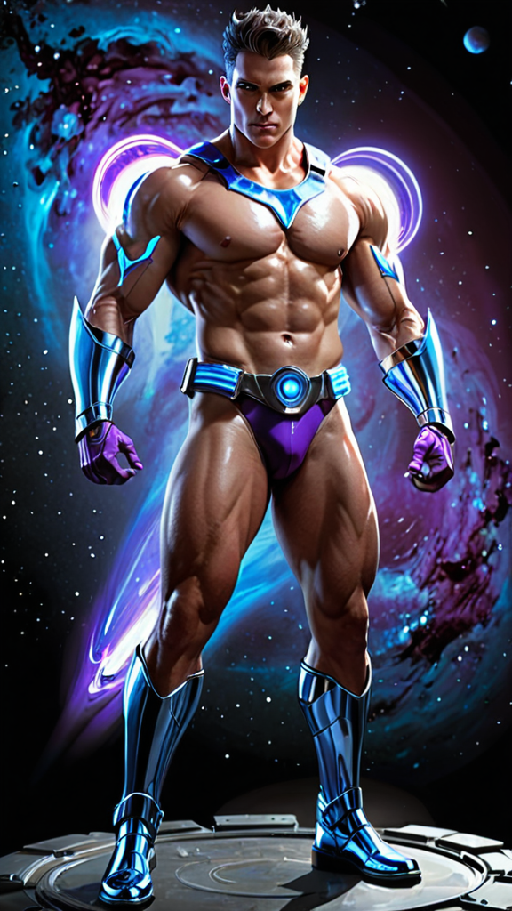 Ultra-futuristic super-hero, cosmic being, space warrior. He radiates energy like a star, and can blast his enemies with pure blue-violet cosmic energy/light. His eyes shine with pure white light like stars. He can create and control energy on a molecular level, giving him near limitless power. He can fly through the vacuum of space without needing to breathe, he lives in the cosmos. Hypermasuline Caucasian male. Tall, muscular, bodybuilder's physique, perfect body. Large massive muscles, wide chest and back, well defined abs, narrow waist, thick sinewy arms with big biceps. Strong powerful legs. Strong brow and squared jaw, handsome masculine rugged face. Clean shaven hairless face, super-hero good looks. Eyes shine like stars with pure white light. High fade medium spike hairstyle, short on sides and back, medium spikes on top of head, longer towards the front. Hair is blue-black, dark and shiny. He is completely shirtless, only a shiny chrome harness across his massive chest. A chrome tech belt around his waist with a blue-violet light a the center. Shiny chrome gauntlets on his forearms, also with blue-violet lights. Thin chrome bands around the tops of his biceps. Chrome tech pauldrons on his shoulders, also with blue-violet lights. A shiny chrome jockstrap over his loins, chrome thigh-guards over his massive thighs. Metallic chrome knee-high boots. Full body pose, flying through space, radiating bright blue-violet light. His physique is beautiful to behold...