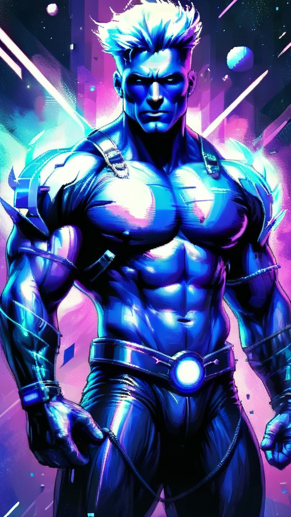 Ultra-futuristic super-hero, cosmic being, space warrior. He radiates energy like a star, and can blast his enemies with pure blue-violet cosmic energy/light. His eyes shine with pure white light like stars. He can create and control energy on a molecular level, giving him near limitless power. He can fly through the vacuum of space without needing to breathe, he lives in the cosmos. Hypermasuline Caucasian male. Tall, muscular, bodybuilder's physique, perfect body. Large massive muscles, wide chest and back, well defined abs, narrow waist, thick sinewy arms with big biceps. Strong powerful legs. Strong brow and squared jaw, handsome masculine rugged face. Clean shaven hairless face, super-hero good looks. Eyes shine like stars with pure white light. High fade medium spike hairstyle, short on sides and back, medium spikes on top of head, longer towards the front. Hair is blue-black, dark and shiny. He is completely shirtless, only a shiny chrome harness across his massive chest. A chrome tech belt around his waist with a blue-violet light a the center. Shiny chrome gauntlets on his forearms, also with blue-violet lights. Thin chrome bands around the tops of his biceps. Chrome tech pauldrons on his shoulders, also with blue-violet lights. A shiny chrome jockstrap over his loins, chrome thigh-guards over his massive thighs. Metallic chrome knee-high boots. Full body pose, flying through space, radiating bright blue-violet light. His physique is beautiful to behold...