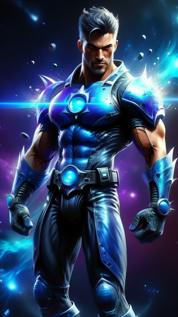 Ultra-futuristic super-hero, cosmic being, space warrior. He radiates energy like a star, and can blast his enemies with pure blue-violet cosmic energy/light. His eyes shine with pure white light like stars. He can create and control energy on a molecular level, giving him near limitless power. He can fly through the vacuum of space without needing to breathe, he lives in the cosmos. Hypermasuline Caucasian male. Tall, muscular, bodybuilder's physique, perfect body. Large massive muscles, wide chest and back, well defined abs, narrow waist, thick sinewy arms with big biceps. Strong powerful legs. Strong brow and squared jaw, handsome masculine rugged face. Clean shaven hairless face, super-hero good looks. Eyes shine like stars with pure white light. High fade medium spike hairstyle, short on sides and back, medium spikes on top of head, longer towards the front. Hair is blue-black, dark and shiny. He is completely shirtless, only a shiny chrome harness across his massive chest. A chrome tech belt around his waist with a blue-violet light a the center. Shiny chrome gauntlets on his forearms, also with blue-violet lights. Thin chrome bands around the tops of his biceps. Chrome tech pauldrons on his shoulders, also with blue-violet lights. A shiny chrome jockstrap over his loins, chrome thigh-guards over his massive thighs. Metallic chrome knee-high boots. Full body pose, flying through space, radiating bright blue-violet light. His physique is beautiful to behold...