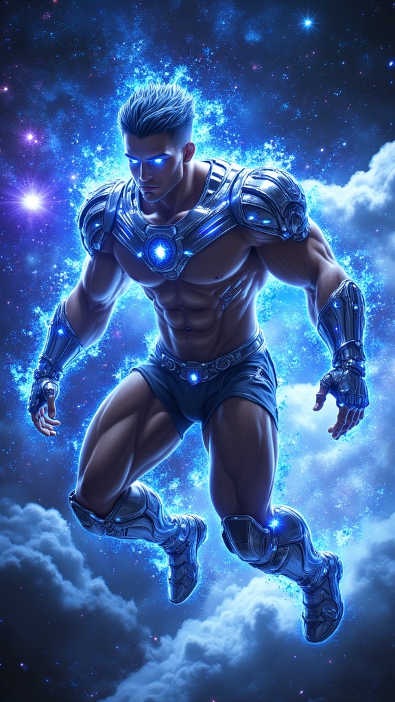 Ultra-futuristic super-hero, cosmic being, space warrior. He radiates energy like a star, and can blast his enemies with pure blue-violet cosmic energy/light. His eyes shine with pure white light like stars. He can create and control energy on a molecular level, giving him near limitless power. He can fly through the vacuum of space without needing to breathe, he lives in the cosmos. Hypermasuline Caucasian male. Tall, muscular, bodybuilder's physique, perfect body. Large massive muscles, wide chest and back, well defined abs, narrow waist, thick sinewy arms with big biceps. Strong powerful legs. Strong brow and squared jaw, handsome masculine rugged face. Clean shaven hairless face, super-hero good looks. Eyes shine like stars with pure white light. High fade medium spike hairstyle, short on sides and back, medium spikes on top of head, longer towards the front. Hair is blue-black, dark and shiny. He is completely shirtless, only a shiny chrome harness across his massive chest. A chrome tech belt around his waist with a blue-violet light a the center. Shiny chrome gauntlets on his forearms, also with blue-violet lights. Thin chrome bands around the tops of his biceps. Chrome tech pauldrons on his shoulders, also with blue-violet lights. A shiny chrome jockstrap over his loins, chrome thigh-guards over his massive thighs. Metallic chrome knee-high boots. Full body pose, flying through space, radiating bright blue-violet light. His physique is beautiful to behold...