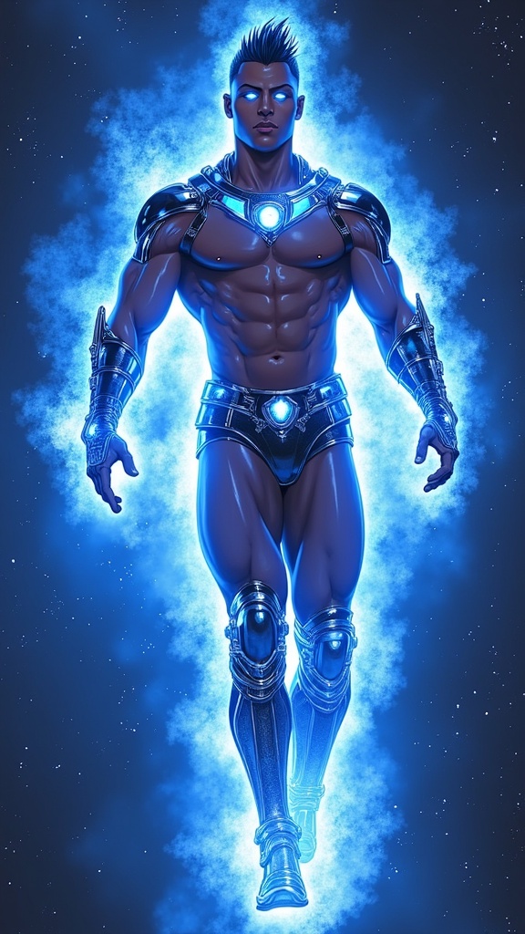 Ultra-futuristic super-hero, cosmic being, space warrior. He radiates energy like a star, and can blast his enemies with pure blue-violet cosmic energy/light. His eyes shine with pure white light like stars. He can create and control energy on a molecular level, giving him near limitless power. He can fly through the vacuum of space without needing to breathe, he lives in the cosmos. Hypermasuline Caucasian male. Tall, muscular, bodybuilder's physique, perfect body. Large massive muscles, wide chest and back, well defined abs, narrow waist, thick sinewy arms with big biceps. Strong powerful legs. Strong brow and squared jaw, handsome masculine rugged face. Clean shaven hairless face, super-hero good looks. Eyes shine like stars with pure white light. High fade medium spike hairstyle, short on sides and back, medium spikes on top of head, longer towards the front. Hair is blue-black, dark and shiny. He is completely shirtless, only a shiny chrome harness across his massive chest. A chrome tech belt around his waist with a blue-violet light a the center. Shiny chrome gauntlets on his forearms, also with blue-violet lights. Thin chrome bands around the tops of his biceps. Chrome tech pauldrons on his shoulders, also with blue-violet lights. A shiny chrome jockstrap over his loins, chrome thigh-guards over his massive thighs. Metallic chrome knee-high boots. Full body pose, flying through space, radiating bright blue-violet light. His physique is beautiful to behold...
