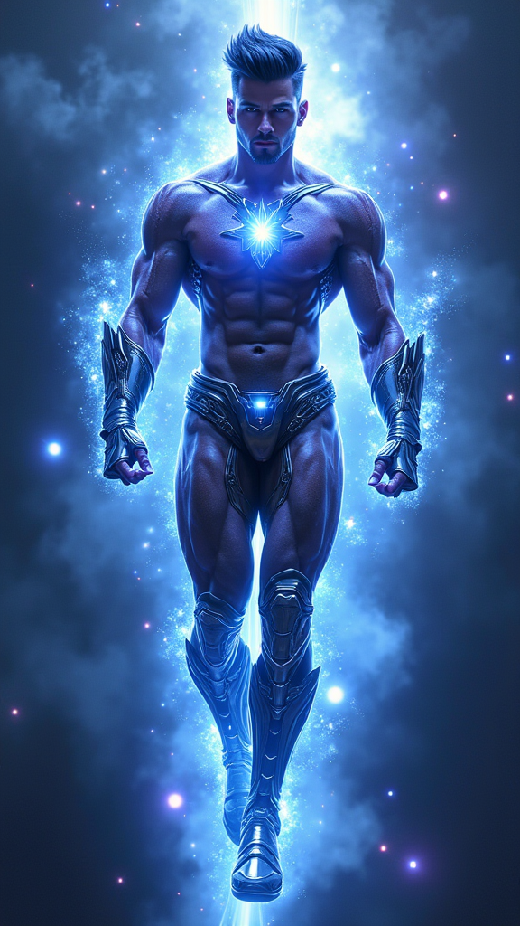 Ultra-futuristic super-hero, cosmic being, space warrior. He radiates energy like a star, and can blast his enemies with pure blue-violet cosmic energy/light. His eyes shine with pure white light like stars. He can create and control energy on a molecular level, giving him near limitless power. He can fly through the vacuum of space without needing to breathe, he lives in the cosmos. Hypermasuline Caucasian male. Tall, muscular, bodybuilder's physique, perfect body. Large massive muscles, wide chest and back, well defined abs, narrow waist, thick sinewy arms with big biceps. Strong powerful legs. Strong brow and squared jaw, handsome masculine rugged face. Clean shaven hairless face, super-hero good looks. Eyes shine like stars with pure white light. High fade medium spike hairstyle, short on sides and back, medium spikes on top of head, longer towards the front. Hair is blue-black, dark and shiny. He is completely shirtless, only a shiny chrome harness across his massive chest. A chrome tech belt around his waist with a blue-violet light a the center. Shiny chrome gauntlets on his forearms, also with blue-violet lights. Thin chrome bands around the tops of his biceps. Chrome tech pauldrons on his shoulders, also with blue-violet lights. A shiny chrome jockstrap over his loins, chrome thigh-guards over his massive thighs. Metallic chrome knee-high boots. Full body pose, flying through space, radiating bright blue-violet light. His physique is beautiful to behold...