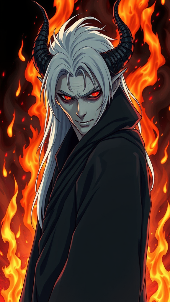 Ultra-high definition, 164k resolution, intricately detailed image capturing the essence of an anime-inspired demon middle-aged man. He is cloaked in a dark robe, presented in a full-body, panned-out view that showcases a masterpiece of artistic detail. The focus is on a hyperdetailed masculine face with a defined nose, and an entire complete body that boasts perfect anatomy. His striking features include beautifully rendered, long white hair and piercing red eyes set against pale white skin. The demon is depicted standing in an infernal background, encircled by towering flames, creating a vivid illustration that embraces hyperrealism. The composition is clear and without flaws, emphasizing natural proportions and anatomy. The work avoids text, cropping issues, low quality, or visual artifacts, ensuring it does not include duplicates, morbid themes, or artistic failings such as poorly drawn elements or distortions. The demon's form is singular, avoiding extra appendages, disfigurement, or missing parts, maintaining a consistent and compelling portrayal.