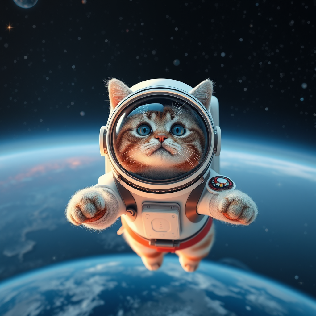 Ultra-High-Definition 8k image of an adorable cat wearing a realistic astronaut suit floating in space, surrounded by twinkling stars and distant galaxies, with the helmet visor reflecting the Earth below.
