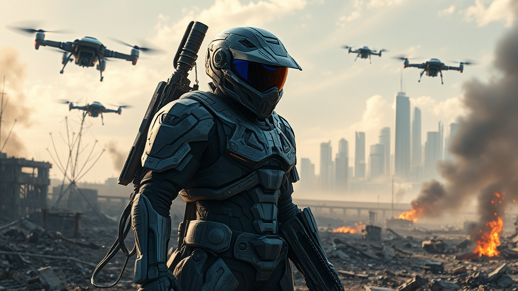Ultra-high-definition digital painting of a futuristic sci-fi soldier clad in advanced, intricate armor featuring a sleek visor and high-tech weaponry. The soldier stands amidst a war-torn battlefield, surrounded by hovering drones and smoldering debris. In the distance, the skyline of a futuristic city looms, partially shrouded in smoke. Dynamic lighting casts dramatic shadows, highlighting the contrast between the soldier's technological prowess and the chaotic destruction around them.