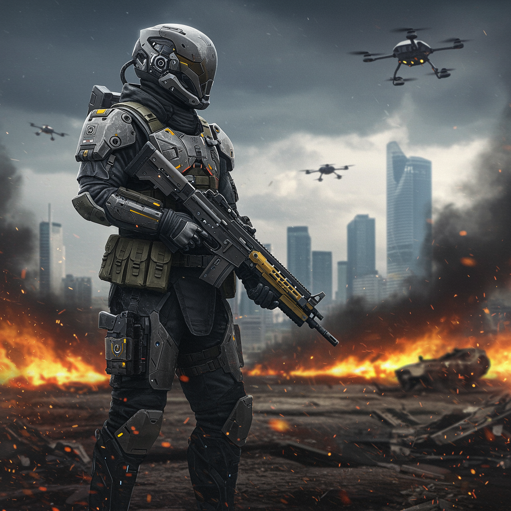 Ultra-high-definition digital painting of a sci-fi futuristic soldier clad in advanced, intricately detailed armor. The soldier wields high-tech weaponry and sports a sleek, reflective visor. They stand resolute against a backdrop of a war-torn battlefield, where hovering drones patrol the skies. The ground is littered with burning debris and wreckage, while a distant, modern cityscape with towering buildings looms on the horizon, bathed in dynamic, moody lighting. The scene evokes a blend of chaos and futuristic technological advancement.