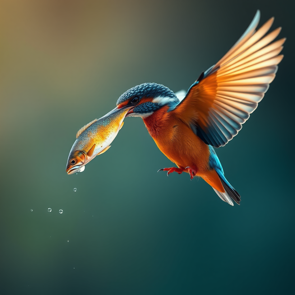 Ultra high-definition image of a striking kingfisher swooping to catch a shimmering fish, vibrant colors of blue and orange, dramatic cinematic lighting, captured with 85mm lens, aspect ratio 16:9, enhanced details and texture.