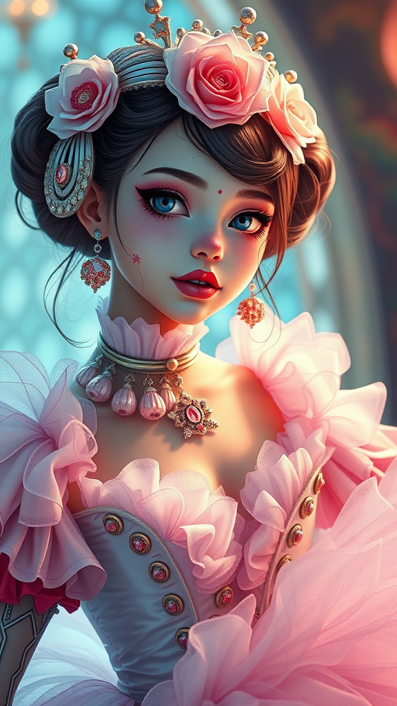 Ultra-high-definition Pixar-esque portrait of an exquisite, futuristic ballerina with clown influences, a mix of celestial elegance and rich Russian heritage, combined with advanced cyborg elements. The scene captures a college-age girl with perfect symmetry, intricately detailed with golden ratio precision. Set in a vibrant blend of sci-fi and fantasy, the atmosphere exudes a cyberpunk aura, with luxurious, decadent details. The digital painting style evokes the finesse of Ever After High and the sleekness of an octane render. A masterpiece fit for ArtStation, the image possesses a smooth, sharp clarity reminiscent of artgerm, loish, and wlop.