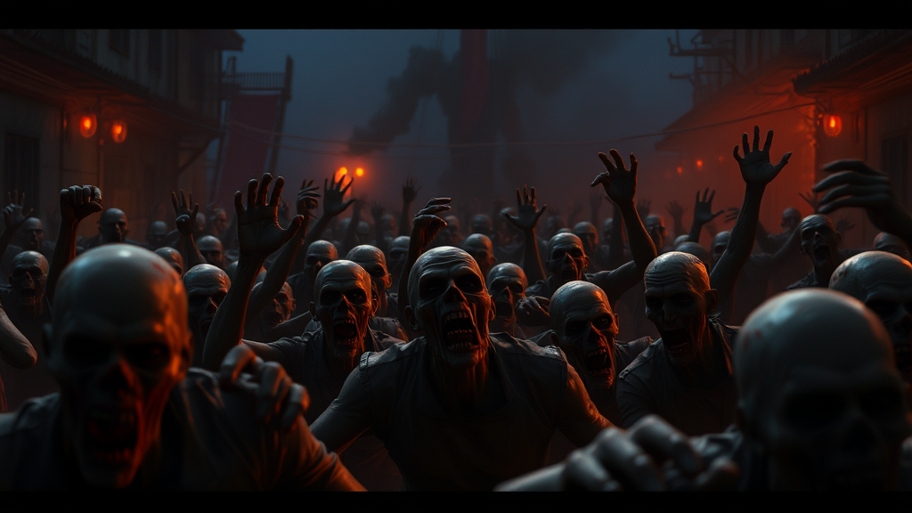 Ultra-high-definition scene from an animated movie, featuring a zombie horde in a dark, moody setting with a blend of horror and wonder. The detailed 3D CGI animation showcases a captivating use of shadows and cinematic lighting, enhancing the eerie atmosphere. The color palette features deep, rich tones, creating a visually stunning and immersive experience.