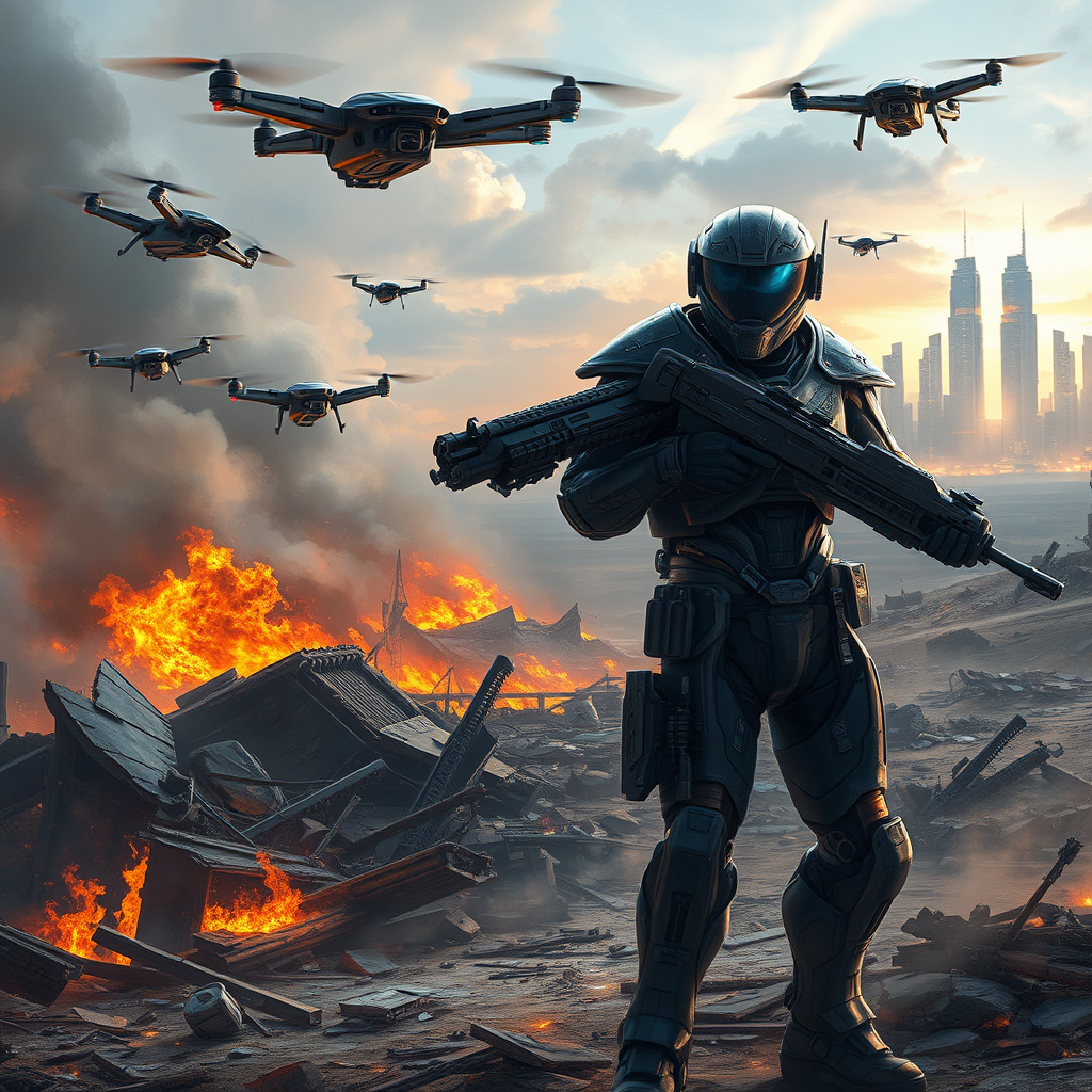 Ultra-high-definition sci-fi futuristic soldier in advanced armor, wielding high-tech weaponry and a sleek visor, stands amidst a war-torn battlefield. Hovering drones fill the sky over burning wreckage, with a distant, gleaming city skyline providing a stark contrast. The scene is rendered as a digital painting, showcasing dynamic lighting and intricate details, capturing the tension and technological advancement.