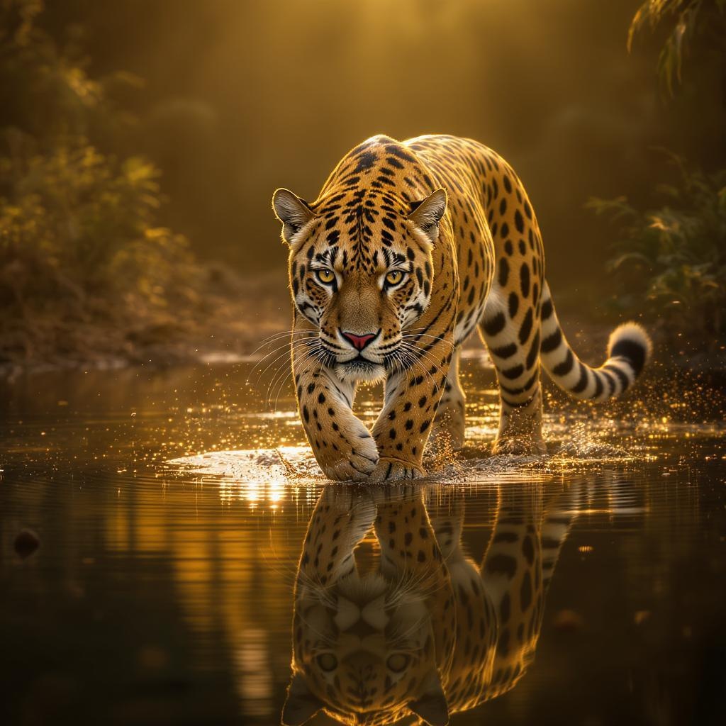 Ultra high resolution award-winning portrait of a majestic jaguar gracefully walking across a shimmering water surface, capturing its reflection with dramatic cinematic lighting. The composition follows the golden ratio, emphasizing elegance and precision. Every detail is meticulously captured in sharp 4k focus, showcasing a masterpiece of nature. Enhanced with backlight and HDR effects, the image reflects an exquisite blend of natural beauty and artistic brilliance.