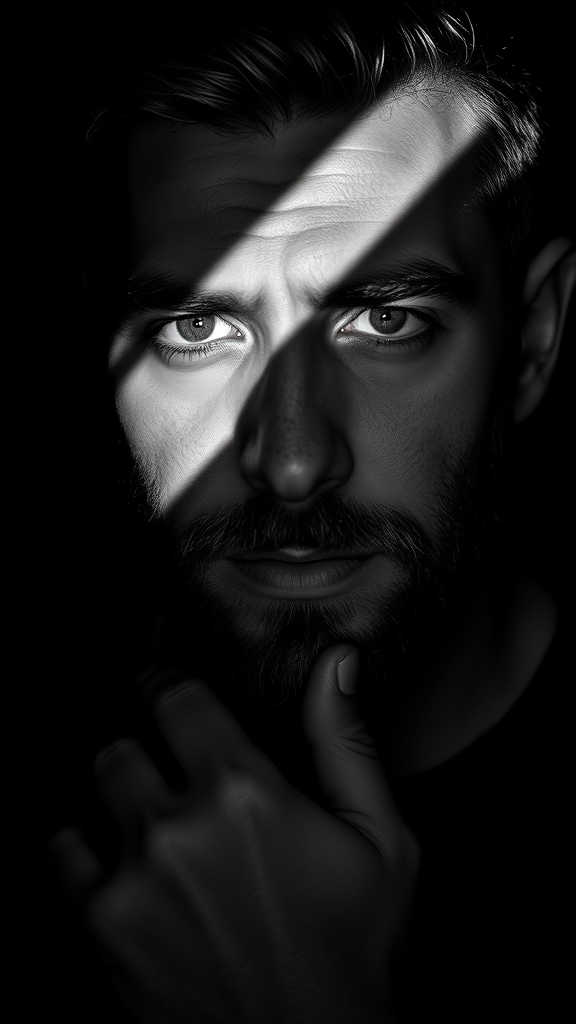 Ultra high-resolution black and white portrait photography captures the essence of classic noir with a modern, intimate psychological edge. A close-up front profile of a man in his thirties, with a well-groomed beard, is illuminated to highlight facial features, creating compelling texture and depth. Utilizing a Canon EOS 5D Mark IV with a Canon EF 85mm f/1.2L II USM lens, the shallow depth of field enhances the emotive bokeh effect. In manual mode, a single off-camera flash with a snoot directs light strategically, casting a dramatic diagonal divide across his face, reminiscent of chiaroscuro. His deep-set eyes, framed by a furrowed brow, convey introspection and internal conflict. The minimalist setup emphasizes the subject's presence, with no background to distract from the emotive narrative. The darkness envelopes him, directing attention to light and shadow interplay. His thoughtful hand placement, fingers gently resting on his chin, deepens the introspective quality, inviting viewer reflection. The portrait's ultra-realistic details in UHD offer layers of human complexity, each highlighted ridge and shadowed contour speaking to the silent profundity of internal dialogue.