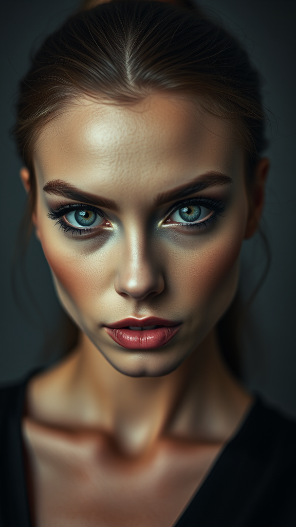Ultra high-resolution, film grain texture, elegant and refined finish, striking makeup, sophisticated studio setting, intense closeup, gazing directly into the camera, poised stance, exceptionally beautiful, sophisticated fine art style, 8k clarity, captivating blue-gray eyes.