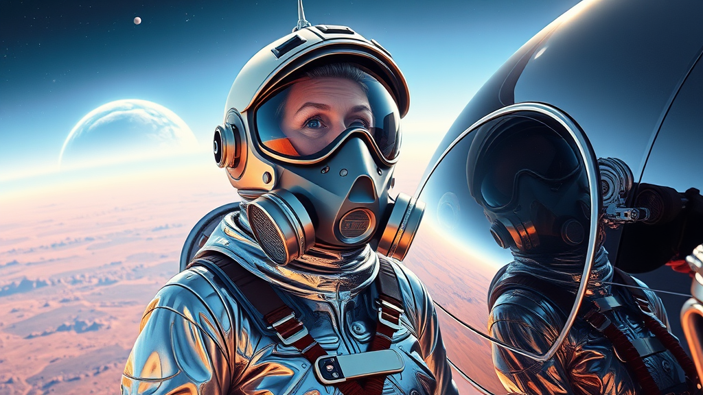 "Ultra-high-resolution image of a grandmother space explorer donning a futuristic visor and respirator, standing beneath an expansive alien sky, her reflection captured in the gleaming chrome of a sleek spaceship. The image is intricately detailed, capturing the essence of classic science fiction with influences from the Eddie Jones cover art style, reminiscent of the sleek and witty universe from Harry Harrison's Stainless Steel Rat. Her suit glistens with superfine detail, casting her as a blend of wisdom and adventure, with a backdrop that hints at the vastness and mystery of space exploration."