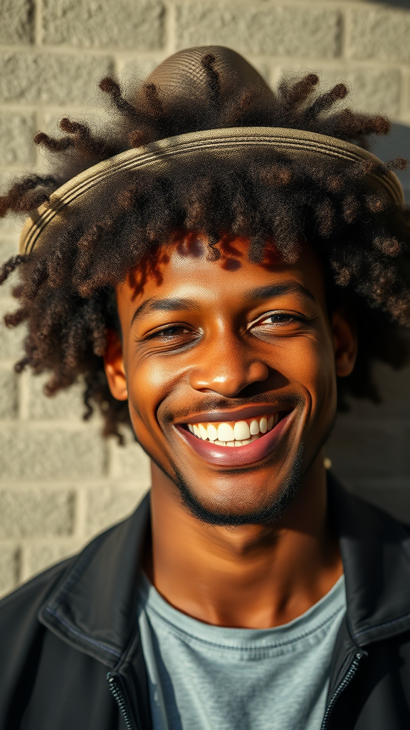 Ultra high resolution photo captured with a Canon EOS R6 featuring a man with a radiant smile and curly afro hair with distinctive bangs, set against a backdrop with real shadows. The scene is captured using a 135mm lens at 1/1250s, f/2.8, ISO 400. The man wears a trendy hat, exuding a vibrant and welcoming aura. This depiction avoids any digital artifacts or negative visual elements, ensuring a clear and captivating portrait.