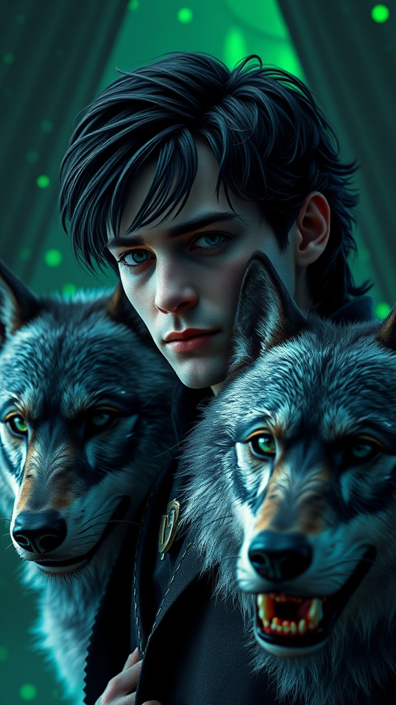 Ultra Photo Realistic, Highly Detailed, distinguished British man, in his twenties, reminiscent of Severus Snape, black Hair, intense black eyes, stylish modern attire, remarkably detailed eyes, subtle eyeliner, accompanied by a grey wolf, full body artwork, inspired by Justin Gerard and Greg Rutkowski, digital art, set against a Dark Ambient Inferno Background with green illumination, Vivid colors, 16k resolution, UHD, HDR10, Absurdres, Model: ReV Animated v1.21, avoiding duplication or disfigurement, maintaining natural proportions without mutation or deformation, ensuring clarity, high resolution, and absence of artifacts or distractions, no watermarks or logos, entirely within the frame, ensuring focus and precision.