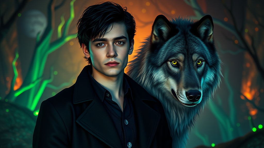 Ultra photo-realistic, highly detailed portrayal of a young British man with a distinguished aura, reminiscent of Severus Snape. He has striking black hair and eyes, accentuated with eyeliner, wearing modern attire. Accompanied by a majestic grey wolf, the duo stands amidst a dark ambient inferno background illuminated with green lights and vivid colors. The scene is crafted in the digital art style of Justin Gerard and Greg Rutkowski, designed for 16k UHD HDR10 resolution, capturing the essence in absurdly high detail. Elements of surrealism surround them, adding a mysterious edge to their presence. The artwork avoids any distortions or anomalies, with a clear focus on realism and intensity.