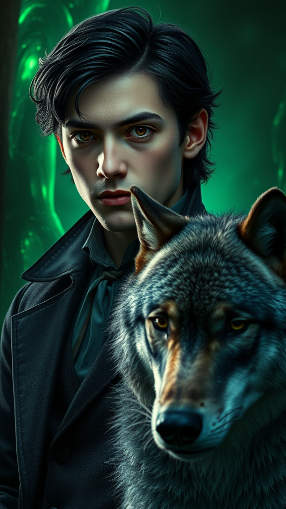 Ultra Photo Realistic, Highly Detailed, refined British gentleman, early adulthood, inspired by Severus Snape, jet black hair, deep black eyes, contemporary attire, intricately detailed eyes, subtle eyeliner, grey wolf as a loyal companion, full body portrait, digital art influenced by Justin Gerard and Greg Rutkowski, set against a Dark Ambient Inferno backdrop infused with green luminescence, vibrant color palette, 16k resolution, UHD, HDR10 quality, Absurdres detail, ensure character remains elegant and proportionate without any deformation or duplication effects, clear and crisp composition, free of any imperfections or distractions such as watermarks or logos.