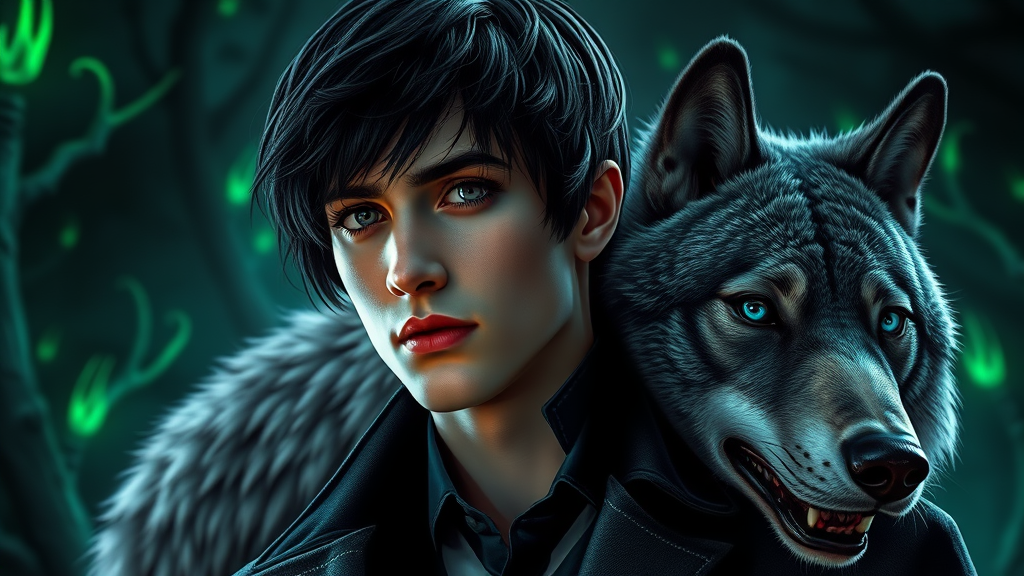 Ultra Photo Realistic, Highly Detailed, refined British gentleman, youthful appearance, inspired by Severus Snape, jet-black hair, deep black eyes, stylish modern attire, intricately detailed eyes, subtle eyeliner, accompanied by a majestic grey wolf, animal companion, full body portrait, digital artwork influenced by Justin Gerard and Greg Rutkowski, Dark Ambient Inferno scenery, illuminated by ethereal green lights, vibrant colors, 16k resolution, HDR10 quality, Absurdres, Model: ReV Animated v1.21, emphasizing artistic integrity and coherence.