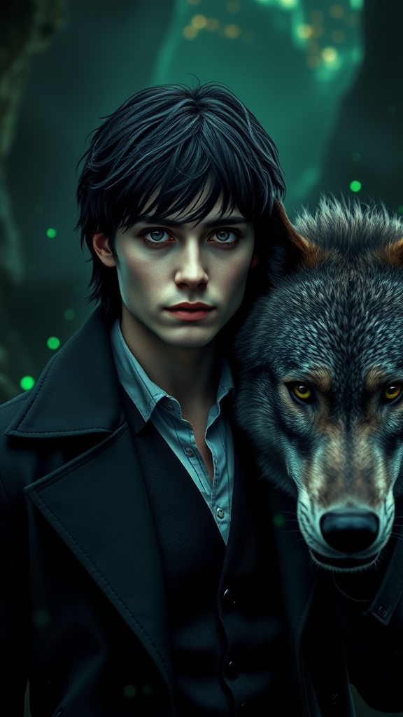 Ultra Photo Realistic, Very Detailed, distinguished British man, young adult, resembling Severus Snape, with jet-black hair and deep black eyes, wearing contemporary attire, intensely detailed eyes with eyeliner, accompanied by a majestic grey wolf, full body portrayal, artwork inspired by Justin Gerard and Greg Rutkowski, set in a Dark Ambient Inferno background with glowing green lights, featuring vivid colors, captured in 16k, UHD, HDR10, Absurdres. Exclude any element of duplication or distortion, ensuring a natural depiction without clone-like features or abnormal traits. The composition should be crisp and clear, avoiding any low-resolution aspects or distractions such as watermarks or text marks, providing an immersive visual experience.