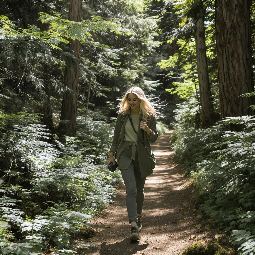 A vibrant, ultra-real image of a blonde social media influencer exploring a lush, sun-drenched forest trail, her hair catching the golden light as it dances gently in the warm breeze; her fashionable hiking attire perfectly complements the vivid greens and earthy browns of her natural surroundings, as she captures the beauty of the moment with her camera, creating a sense of adventurous serenity.