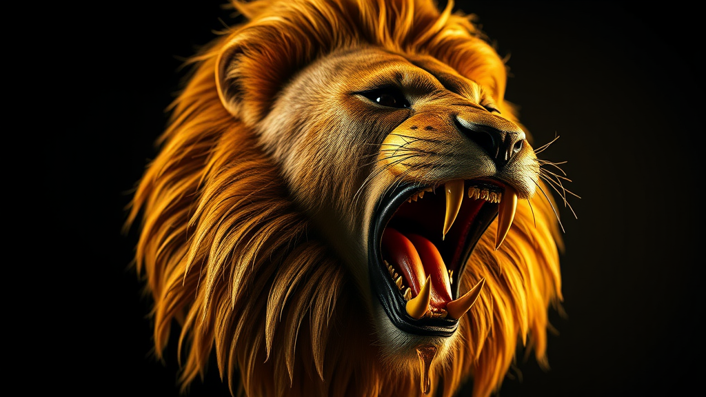 Ultra-realistic 3D render of a majestic lion head roaring, with gold dripping from its mane and mouth, illuminated by dramatic studio lighting, showcasing intricate textures and lifelike details in 8k resolution, employing enhanced visual dynamics and subtle reflections.